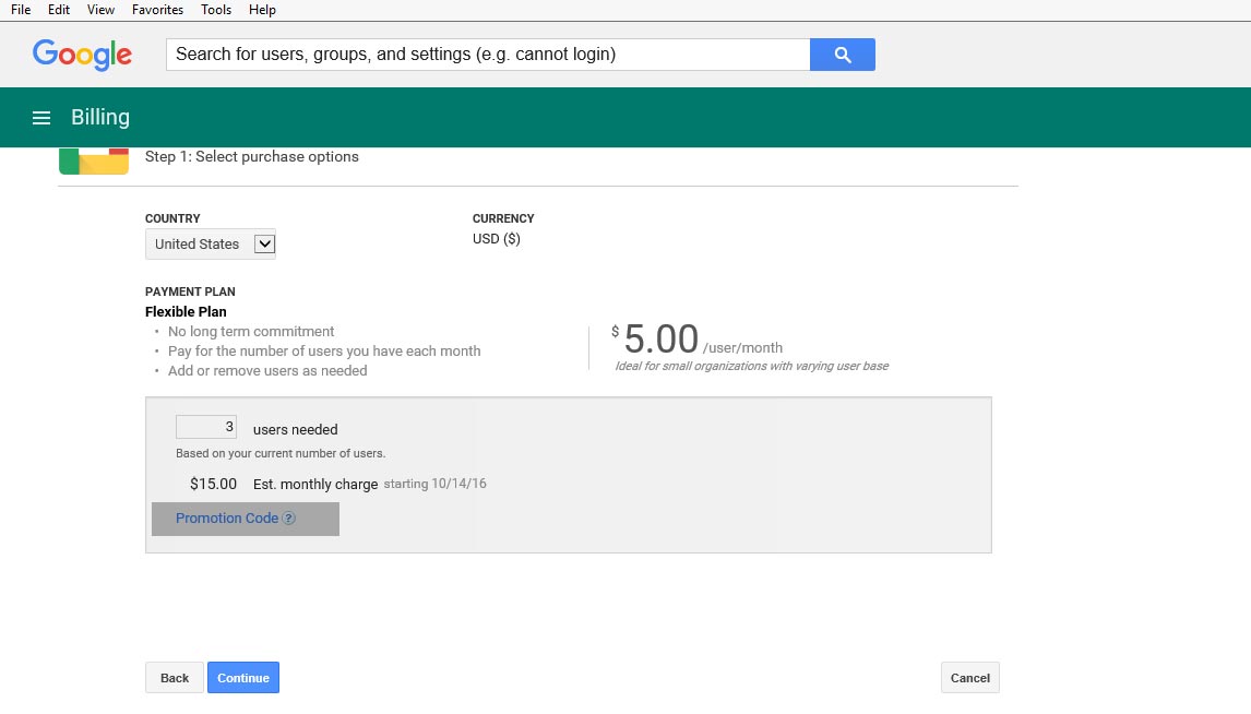 Step 3 – Go to Billing Under Google Apps Admin Console & Use the google apps promotion code
