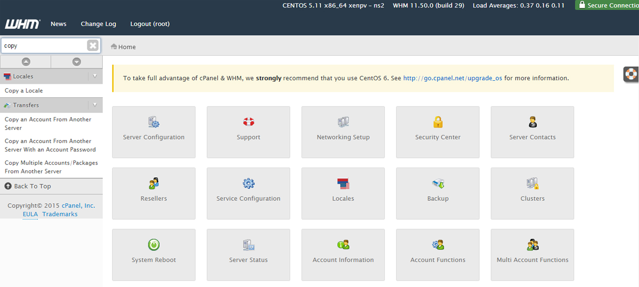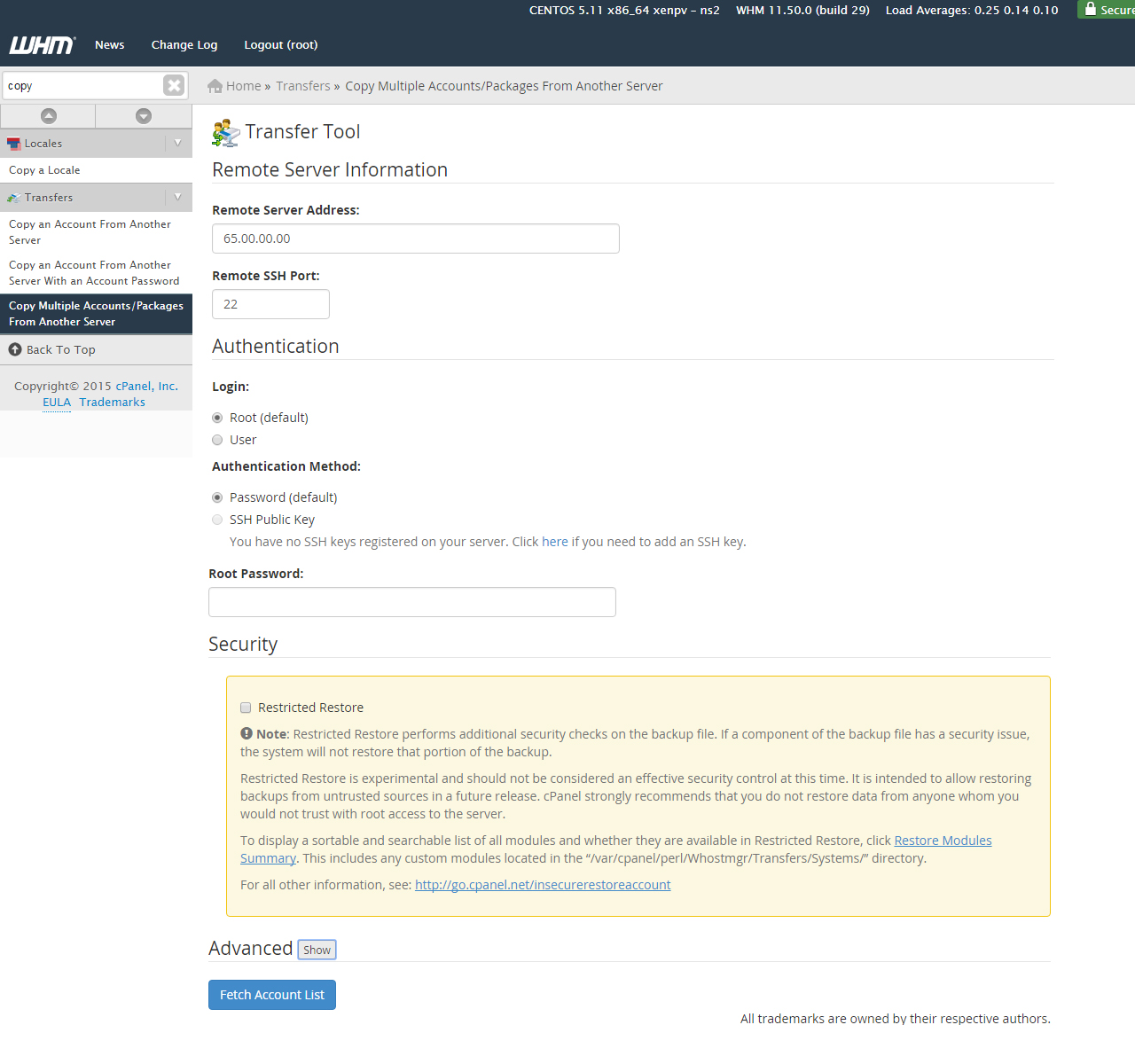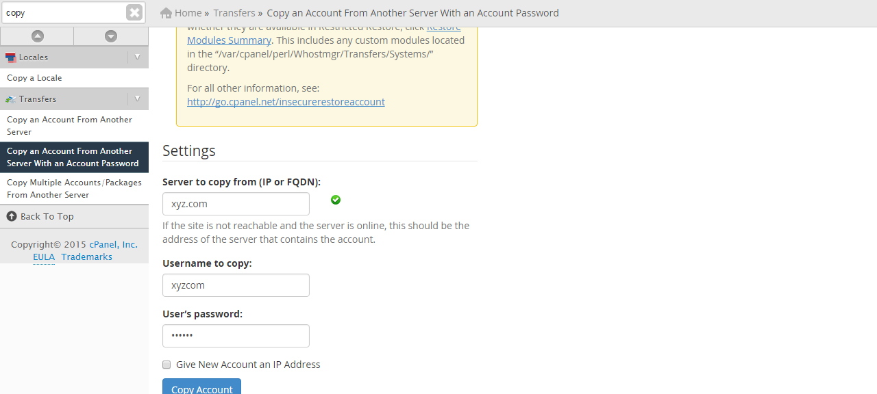 Your WHM panel will just look like this, on left corner in the search bar type “copy” as shown in image then click on the link highlighted in the image. The option you will select will help you to transfer all mails, database, website files to the current new server, since you don’t the the access to the server with SSH, you cannot transfer multiple accounts at once. You will have to transfer each account separately, one by one. The following screen will appear once you click on “Copy an account from another server with an account password”